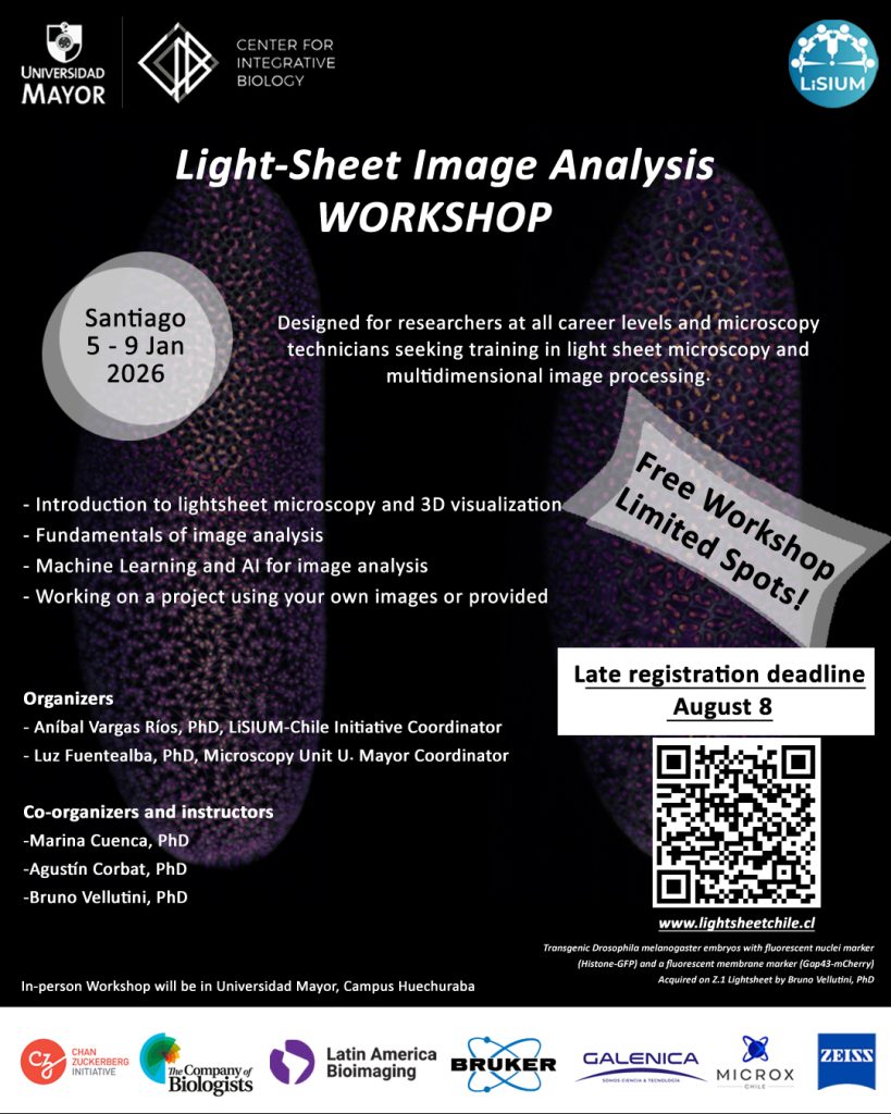 Este workshop tiene como público objetivo estudiantes de todos los niveles, académicas y académicos, investigadores principales, jefes de laboratorio en ciencias biológicas o afines, microscopistas y personal de core facilities en microscopía que quieran formarse en microscopía light sheet y manejo de imágenes multidimensionales.